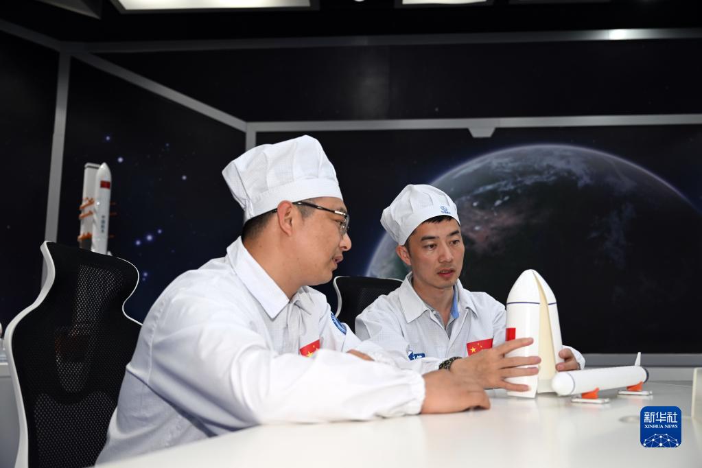 在航天科技集團一院天津火箭公司總裝測試車間,駱鑫生(右)和班組副組長王海洋模擬火箭裝配工作(4月19日攝)。