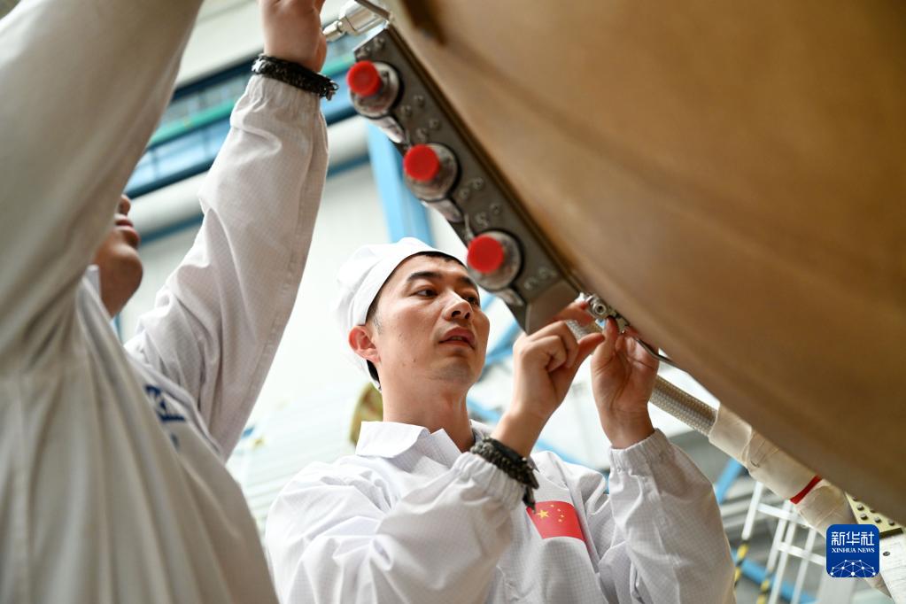 在航天科技集團一院天津火箭公司總裝測試車間,駱鑫生和同事在進行火箭某部件的裝配(4月19日攝)。