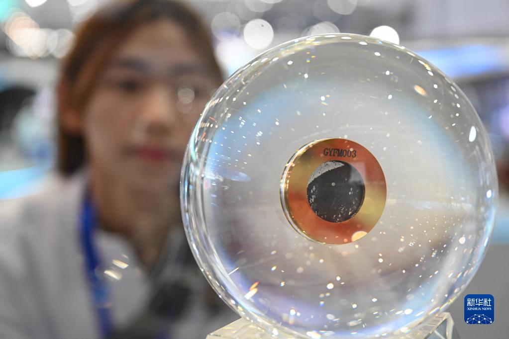 4月24日,觀眾在2023年“中國航天日”科普展覽上觀察月壤。