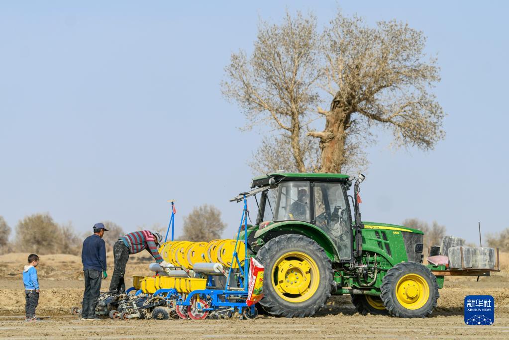 新疆尉犁縣,棉農在調試播種機(3月30日攝)。