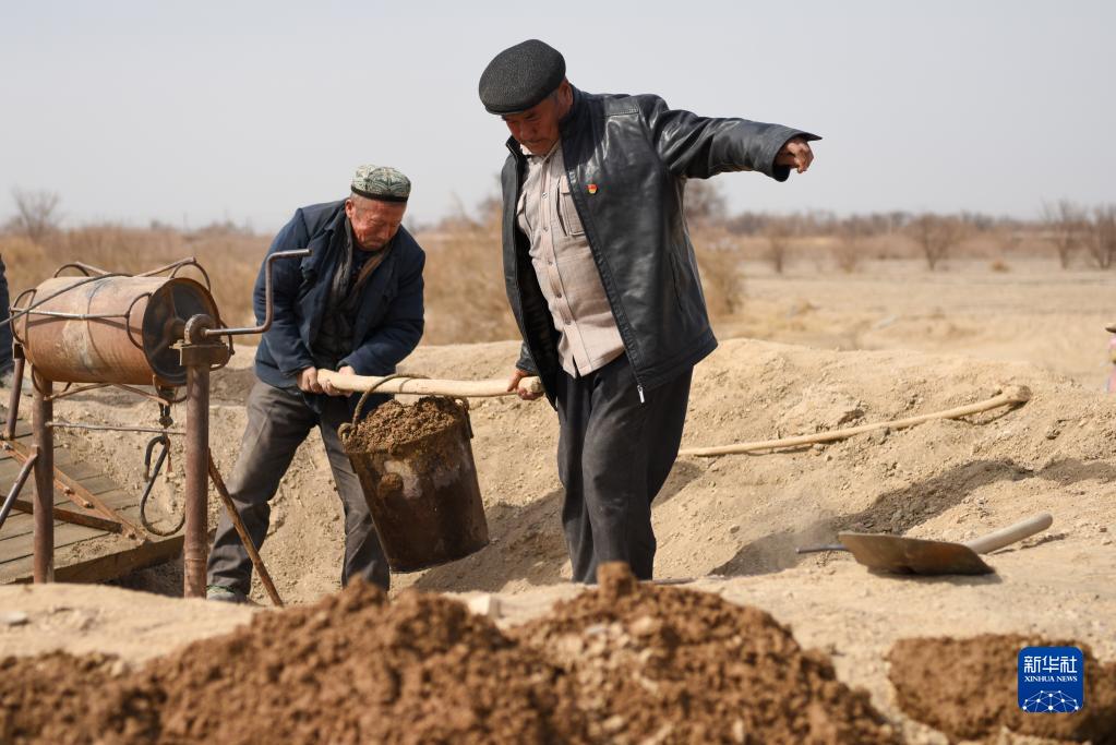 新疆吐魯番市高昌區艾丁湖鎮附近的戈壁灘,花園村掏撈隊隊員傾倒坎兒井內掏出的淤泥(3月9日攝)??矁壕划數厝朔Q為“母親河”,由豎井、暗渠、明渠和蓄水池(澇壩)組成,是荒漠地區利用地面坡度無動力引用地下水的一種獨特地下水利工程。