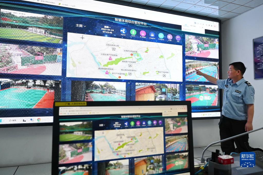 4月24日,西河智慧體育公園工作人員在介紹智慧體育綜合管控平臺。該平臺可對公園內的人流、安全、環境以及公園周邊“15分鐘健身圈”運動場地的門禁、燈光等設備實現智能化管理。