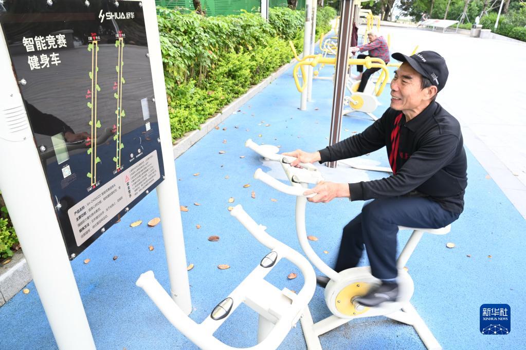 4月24日,市民在福州市鼓樓區西河智慧體育公園使用智能競賽健身車。
