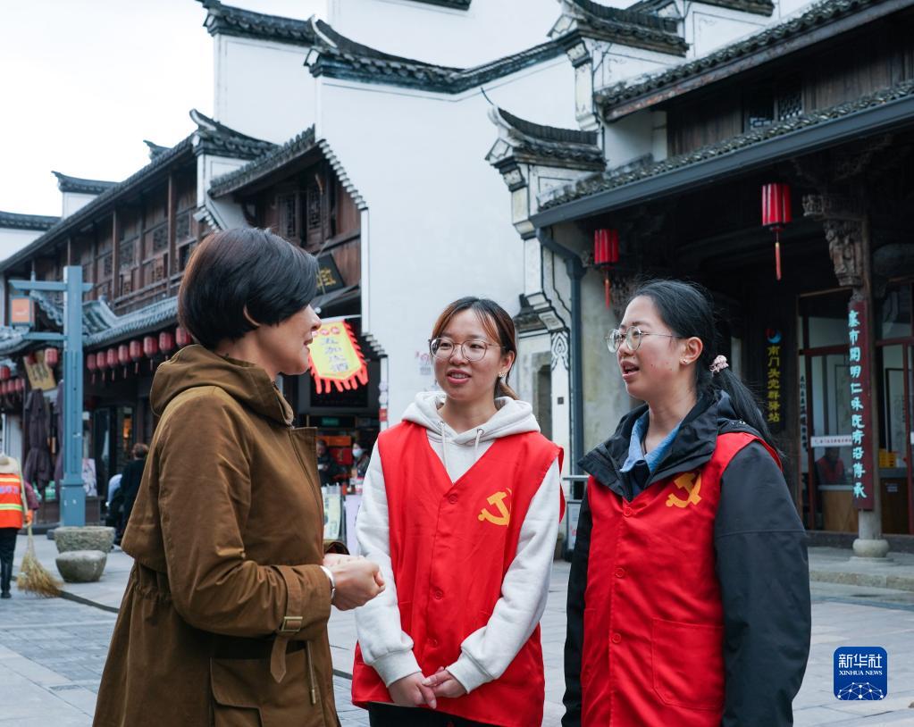4月24日,在建德市梅城鎮古街澄清門下,社區黨員干部、志愿者為游客講解古城歷史。