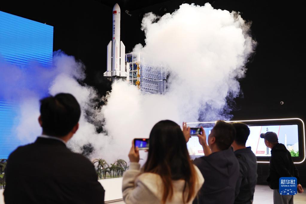 4月24日,觀眾在中國航天博物館觀看長征五號運載火箭發射轉運場景模擬演示。