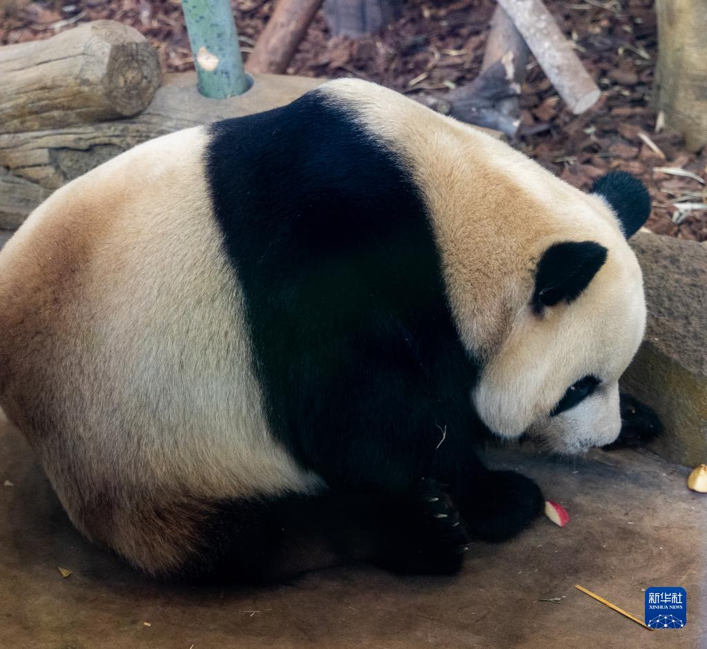 4月24日,在成都大熊貓繁育研究基地,大熊貓“芝麻”在進食。 新華社發(陳居偉 攝)