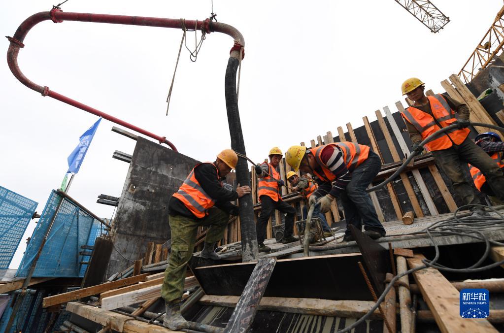 4月24日,在廣西上橫高速公路西津郁江特大橋建設現場,中鐵四局集團工人在進行主塔封頂施工。
