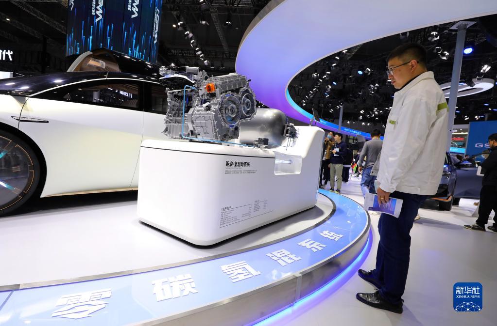 4月24日,參觀者在廣汽展臺上一個鉅浪-氫混動系統展示模型旁駐足觀看。