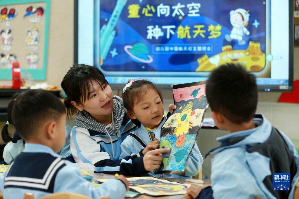4月24日,在貴州省黔南布依族苗族自治州都勻市青云湖幼兒園,孩子們介紹自己創作的航天主題彩繪作品。