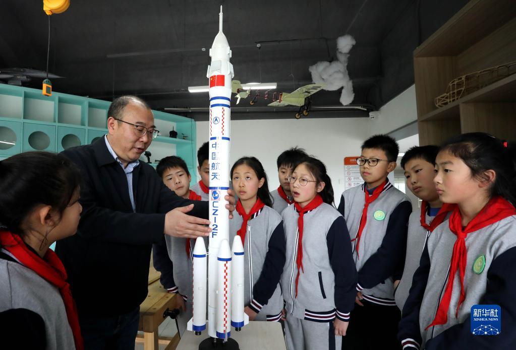 4月24日,在江蘇省蘇州市姑蘇區青少年宮科教實踐中心,科技輔導員為來參觀的學生介紹火箭模型。