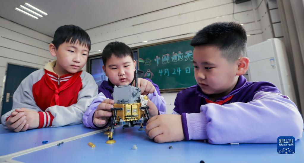 4月24日,河北省遵化市第二實驗小學的學生在組裝航天器模型。