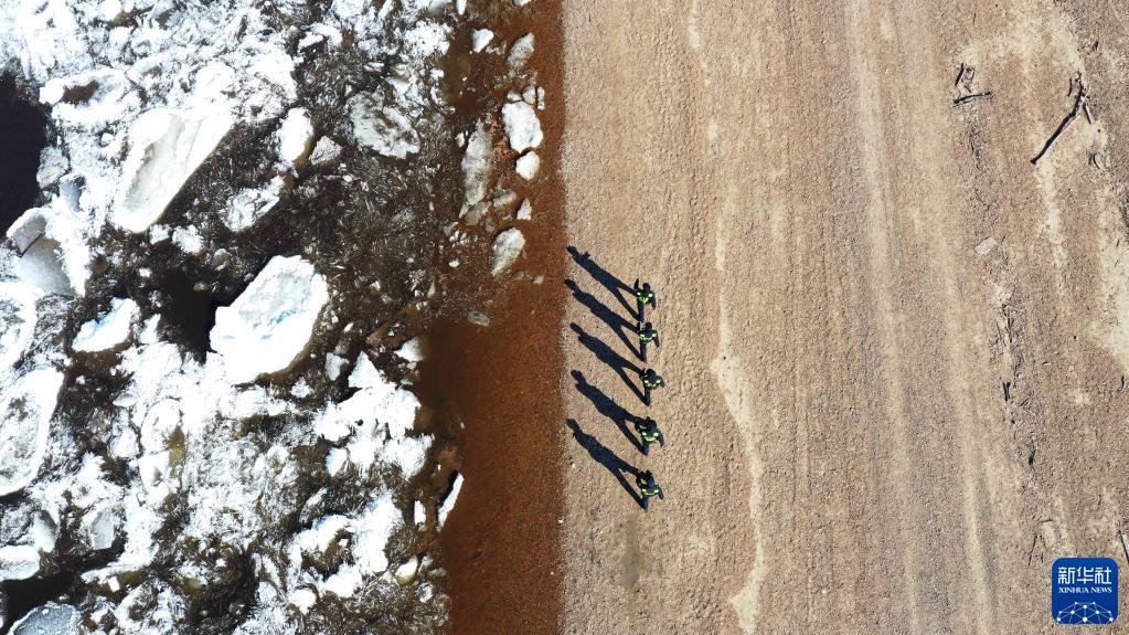 4月24日,黑龍江出入境邊防檢查總站黑河邊境管理支隊大黑河島邊境派出所民警在黑龍江黑河段江岸巡邏,確保安全(無人機照片)。