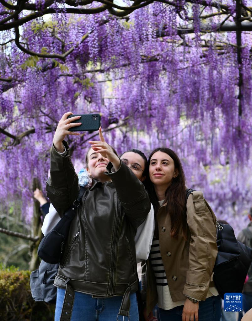 4月24日,在意大利佛羅倫薩,游客在紫藤花旁自拍。