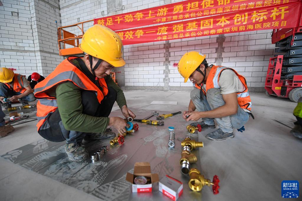4月25日,在深圳前海泰康國際醫院項目工地,建筑工人參加閥門組裝工藝技能比拼。