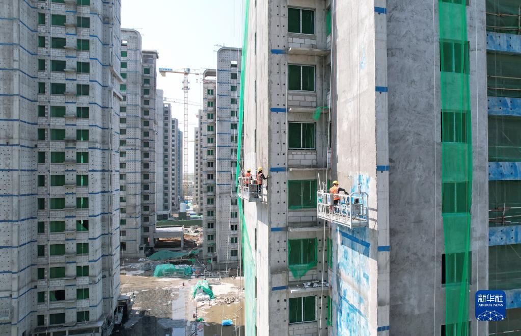4月25日,中鐵二十局的工人在石家莊市高新技術產業開發區集中安置區棚戶區改造項目建設工地施工(無人機照片)。