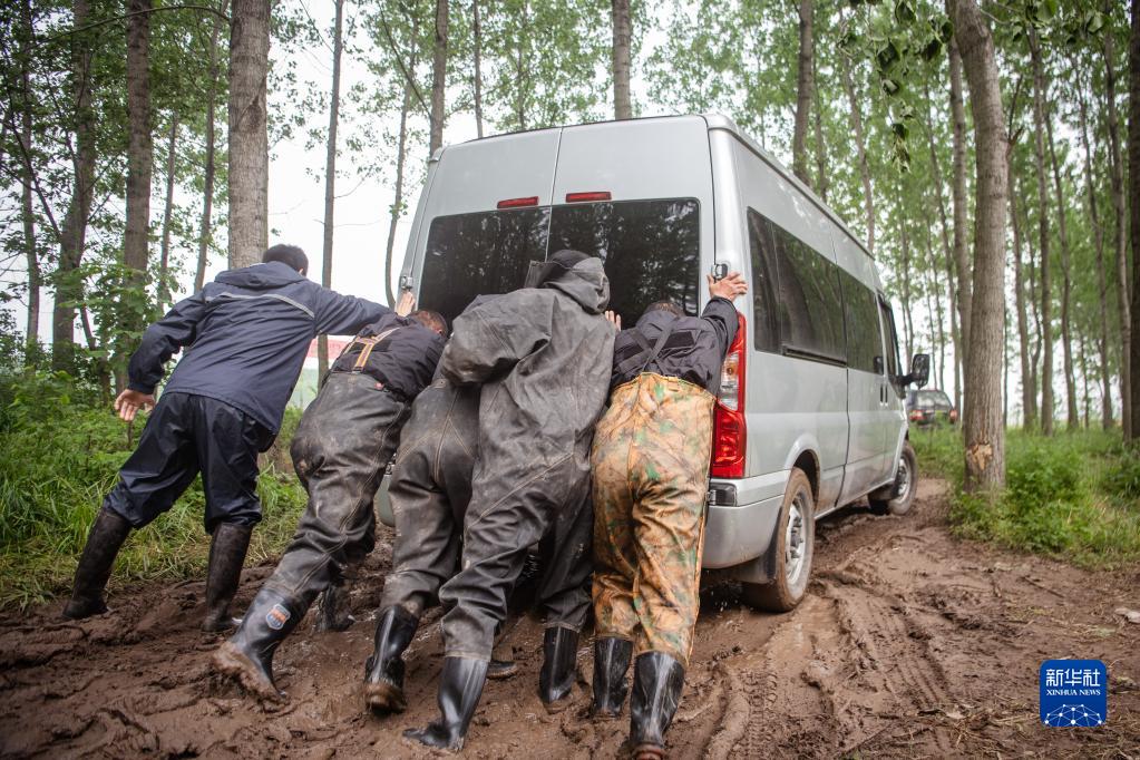 4月25日,工作人員合力推動江豚運輸車輛駛過泥濘路面。