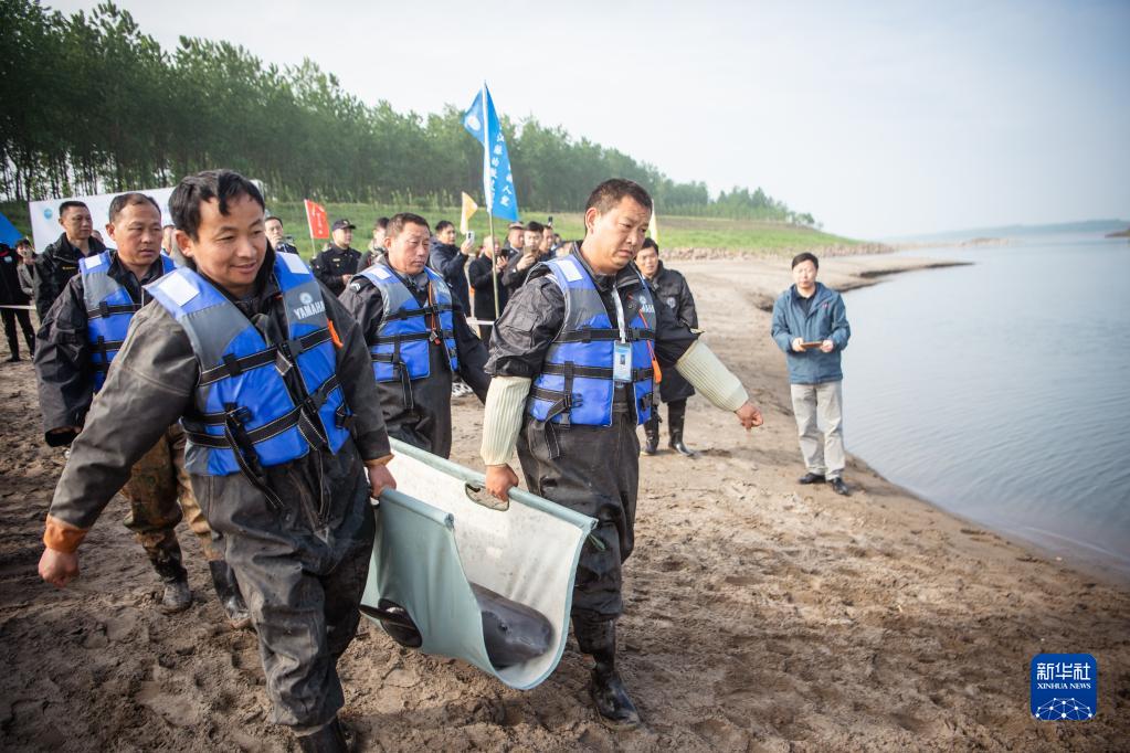 4月25日,工作人員把江豚轉運至江邊放歸。