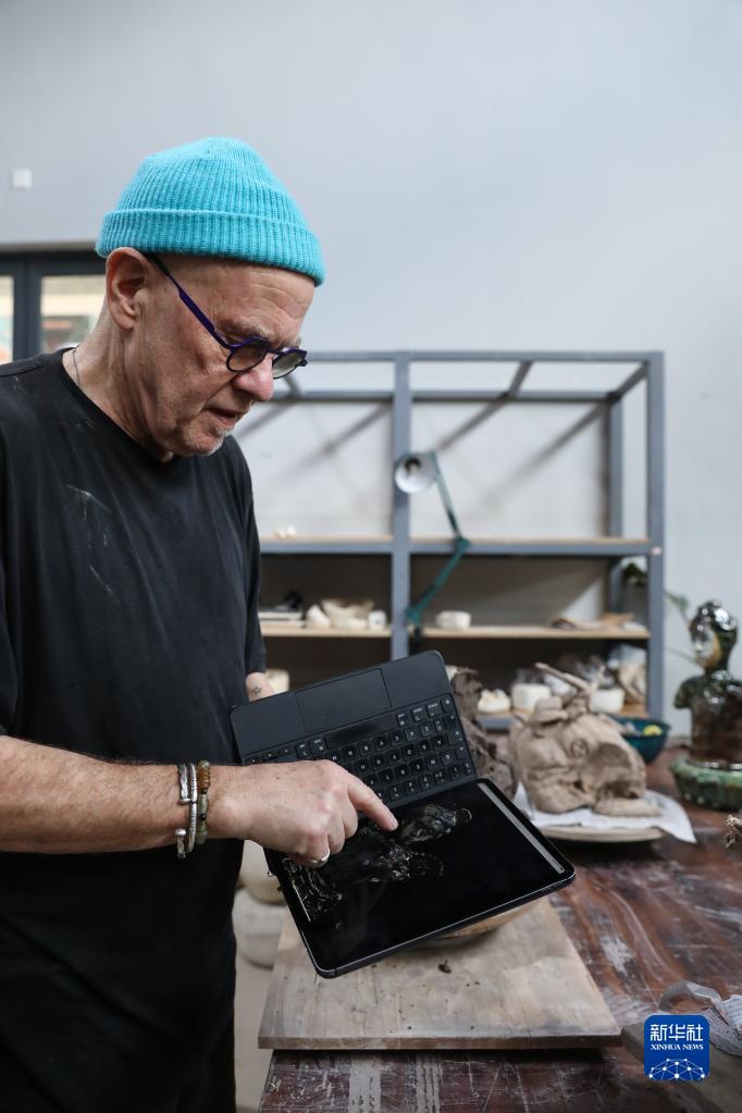 托爾斯滕·尤雷爾在江西景德鎮陶溪川陶瓷文化創意園自己的工作室內介紹作品(4月20日攝)。