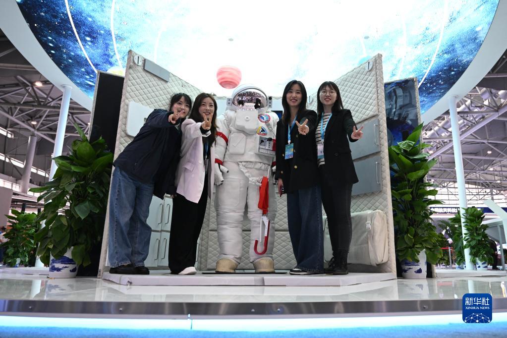 4月24日,觀眾在科普展區內與航天服模型合影留念。