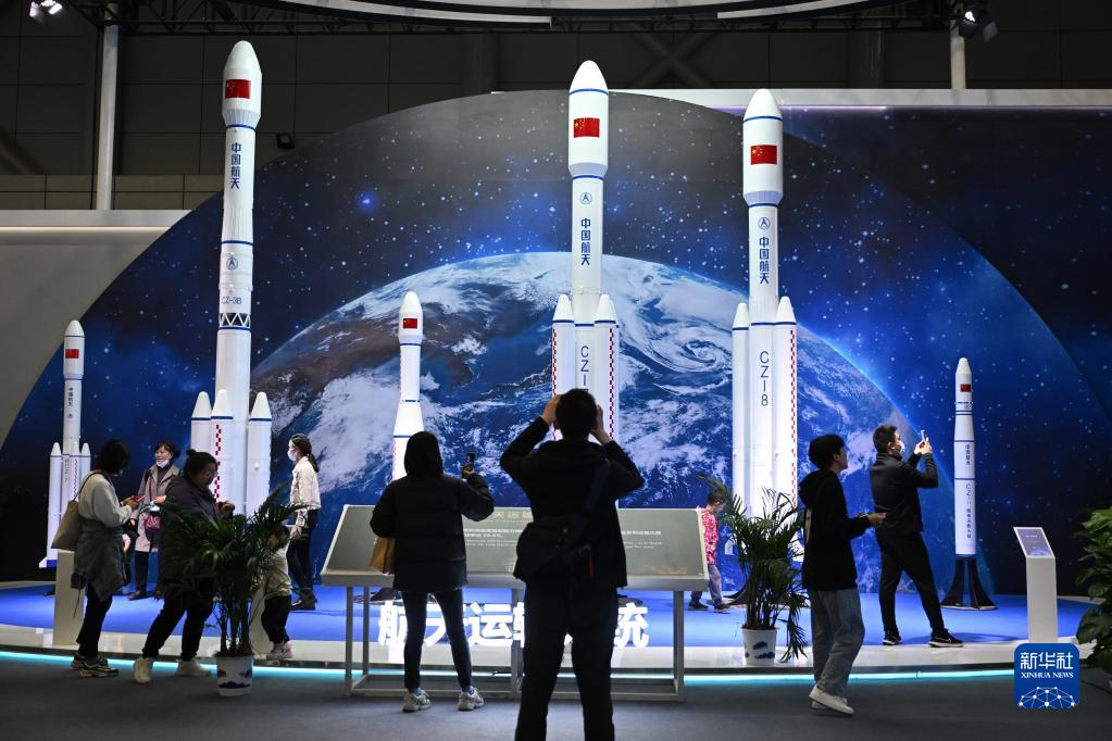 4月24日,觀眾在科普展區參觀運載火箭模型。