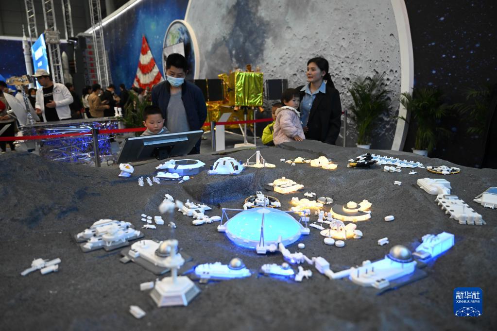 4月24日,觀眾在科普展區參觀“未來月球科研站”設想模型。