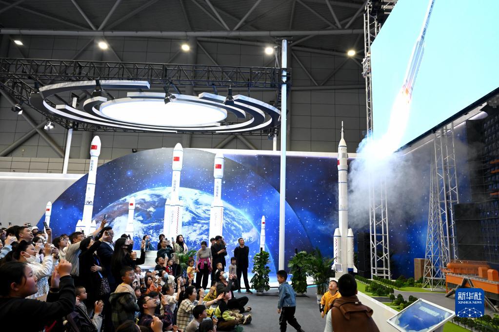4月24日,觀眾在科普展區觀看長征五號B運載火箭模擬發射。