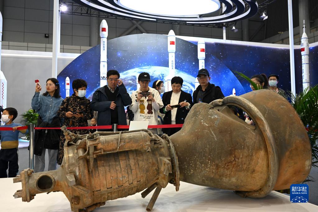 4月24日,觀眾在科普展區參觀長征三號乙運載火箭發動機殘骸實物展品。