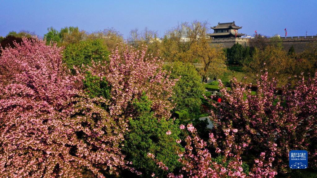 西安明城墻下春花盛開(4月1日攝,無人機照片)。