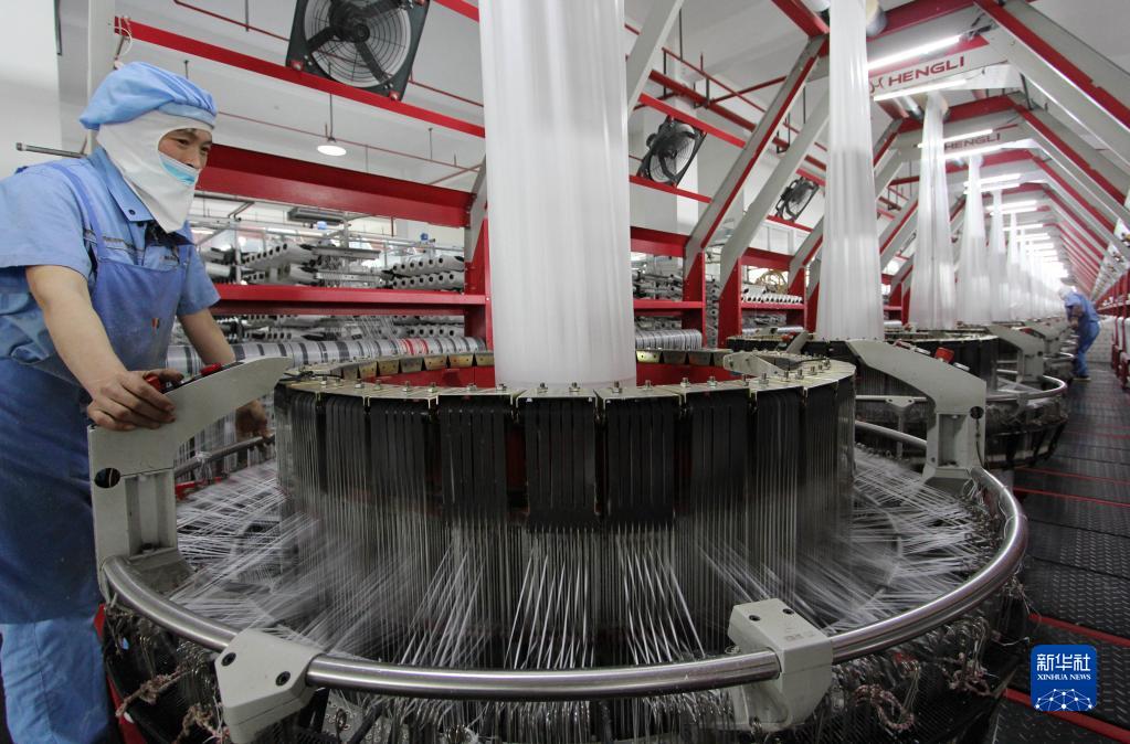 4月25日,在山東省臨沂市臨沭縣一塑編企業車間,工人加工塑編產品。