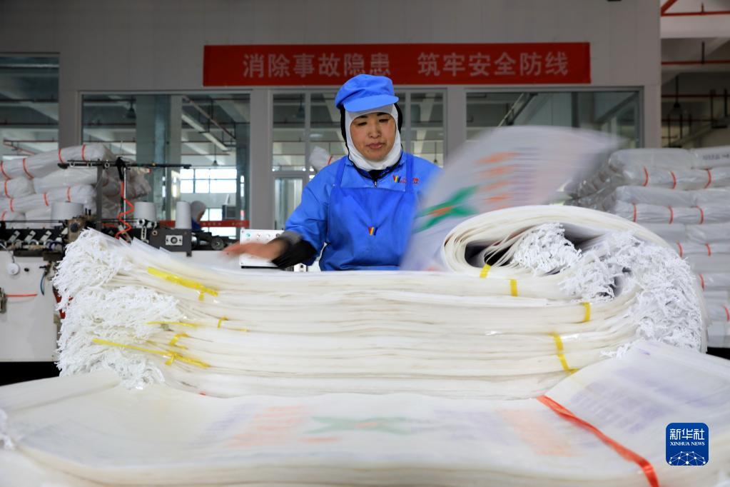 4月25日,在山東省臨沂市臨沭縣一塑編企業車間,工人加工塑編產品。