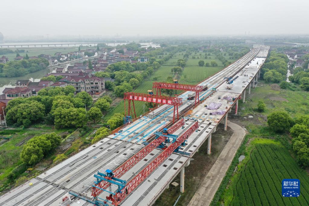 4月25日拍攝的蘇臺高速公路七都至桃源段ST-QL5標施工現場(無人機照片)。