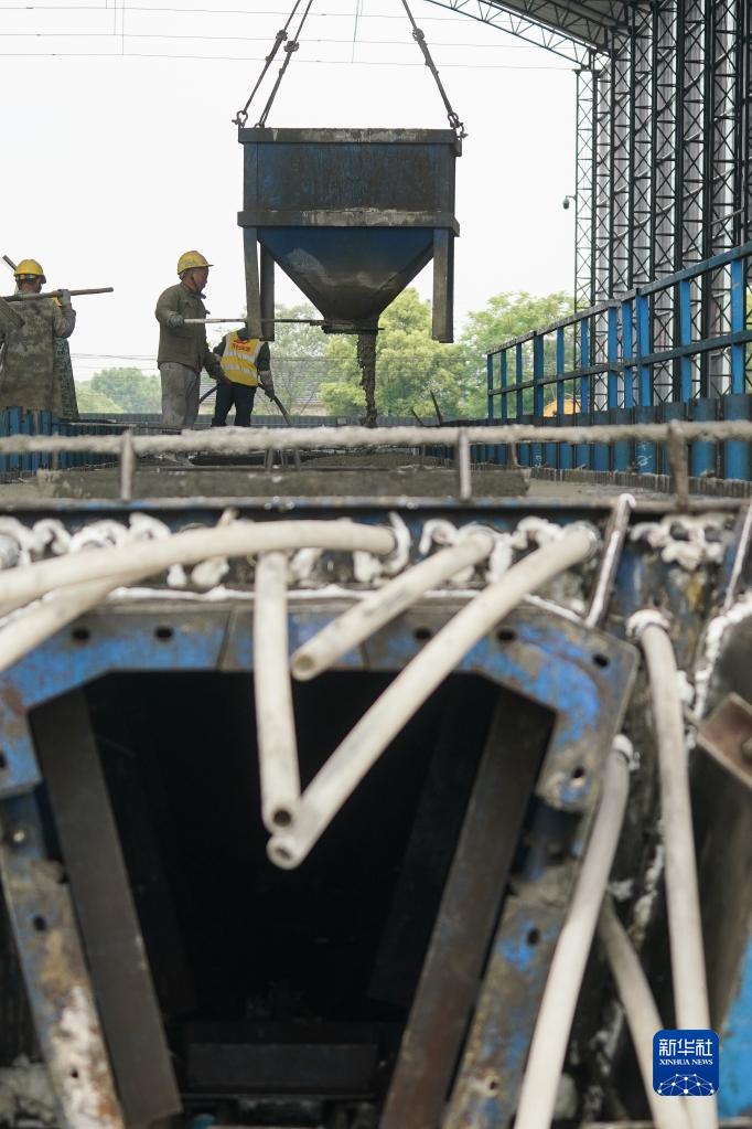 4月25日,中鐵二十局建設者在蘇臺高速公路七都至桃源段ST-QL5標預制梁場澆筑混凝土。