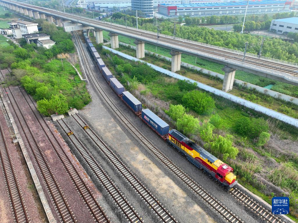 4月25日,江蘇首趟中老鐵路(海安—瑯勃拉邦)國際貨運列車化肥專列駛出南京貨運中心海安貨運站(無人機照片)。