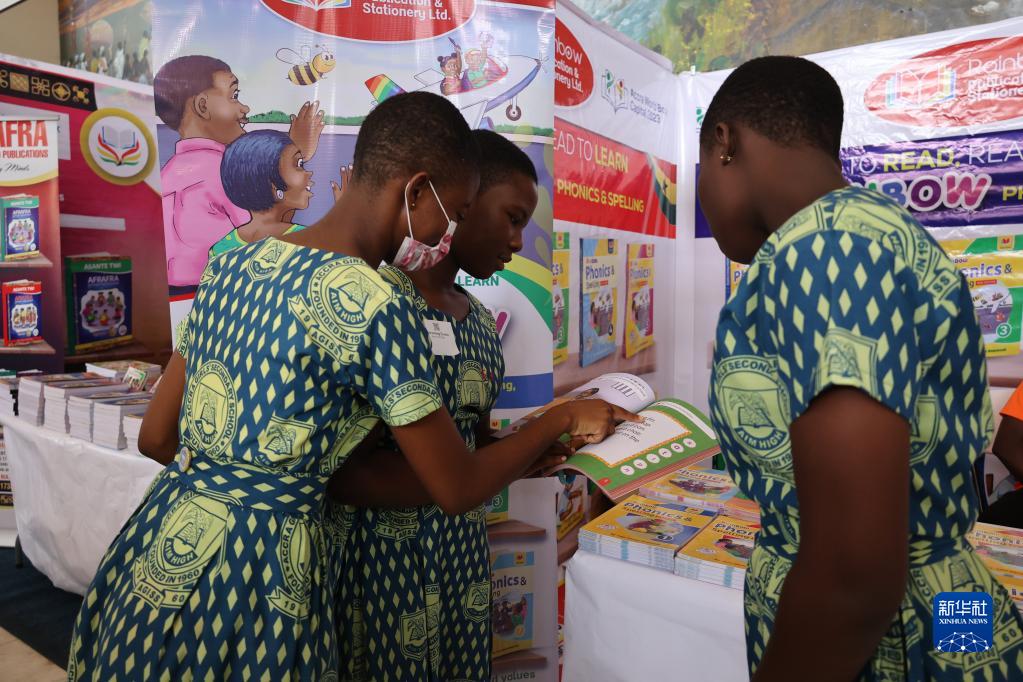 4月24日,在加納首都阿克拉舉辦的圖書展上,幾名學生在閱讀圖書。