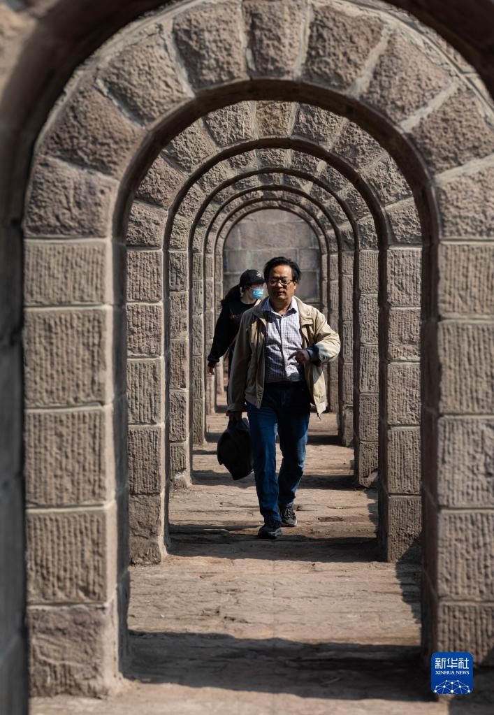 4月25日,人們在瀘縣奇峰鎮的勝利渡槽下層行走??缭烬埾拥膭倮刹鄯稚舷聝蓪?,上層通水,下層為人行通道,非常獨特。