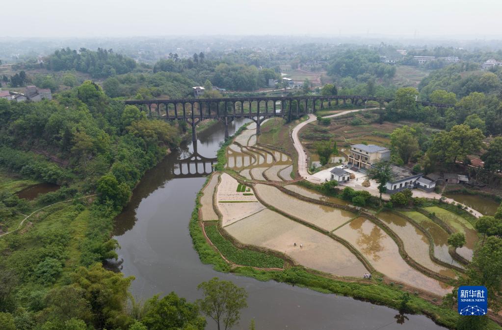 4月25日在瀘縣奇峰鎮拍攝的勝利渡槽(無人機照片)??缭烬埾拥膭倮刹鄯稚舷聝蓪?,上層通水,下層為人行通道,非常獨特。