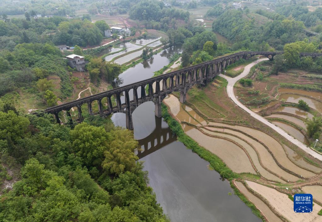 4月25日在瀘縣奇峰鎮拍攝的勝利渡槽(無人機照片)??缭烬埾拥膭倮刹鄯稚舷聝蓪?,上層通水,下層為人行通道,非常獨特。