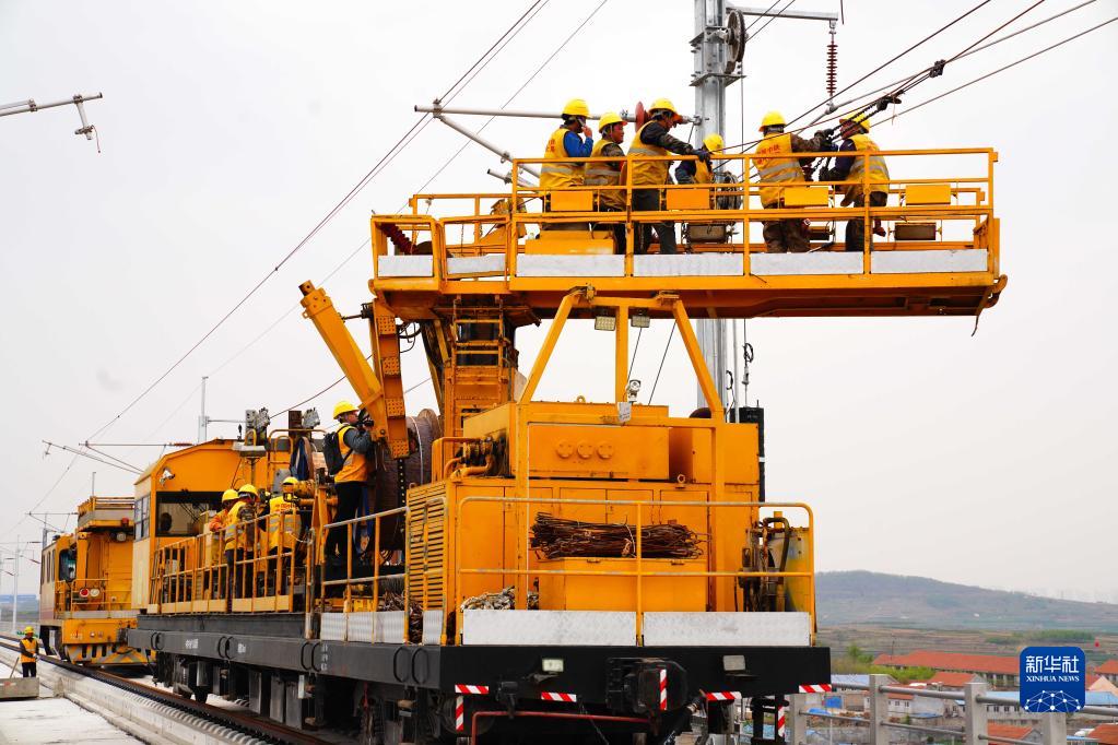 4月25日,在萊榮高鐵萊陽南站至海陽站區間,中鐵電氣化局的工作人員在進行接觸網作業。