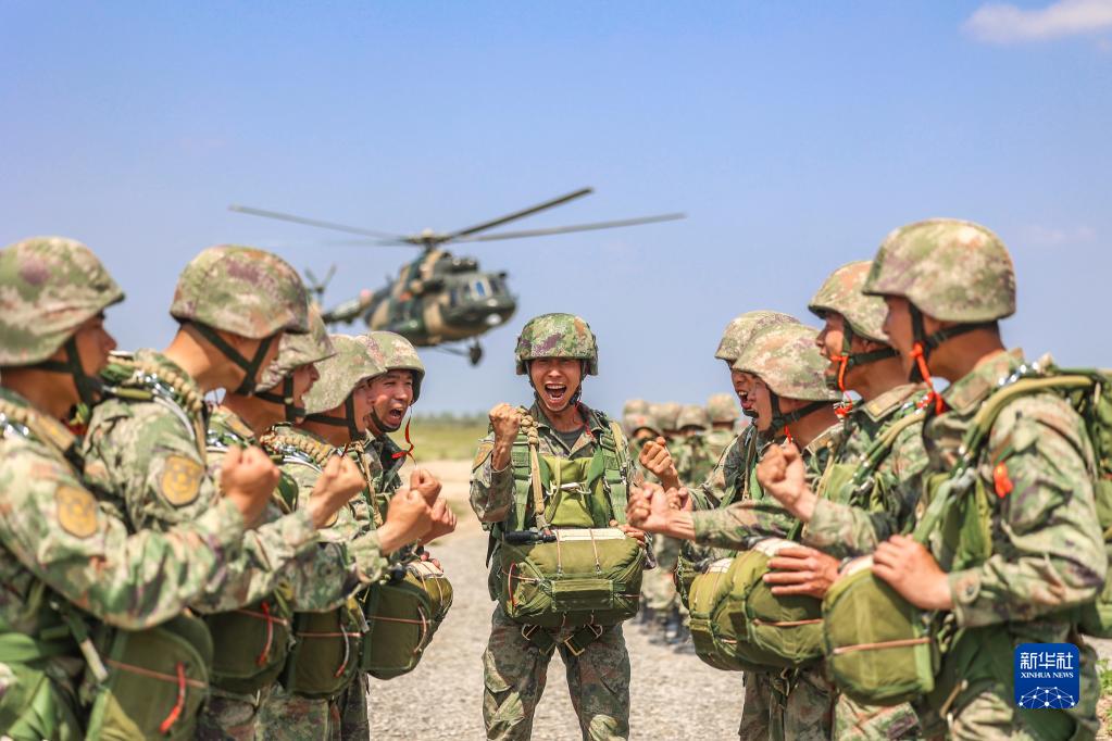 東部戰區陸軍第72集團軍某特戰旅特戰八連組織官兵進行傘降實跳訓練,登機前連長給特戰隊員加油鼓勁(2023年4月20日攝)。新華社發(胡雪峰 攝)