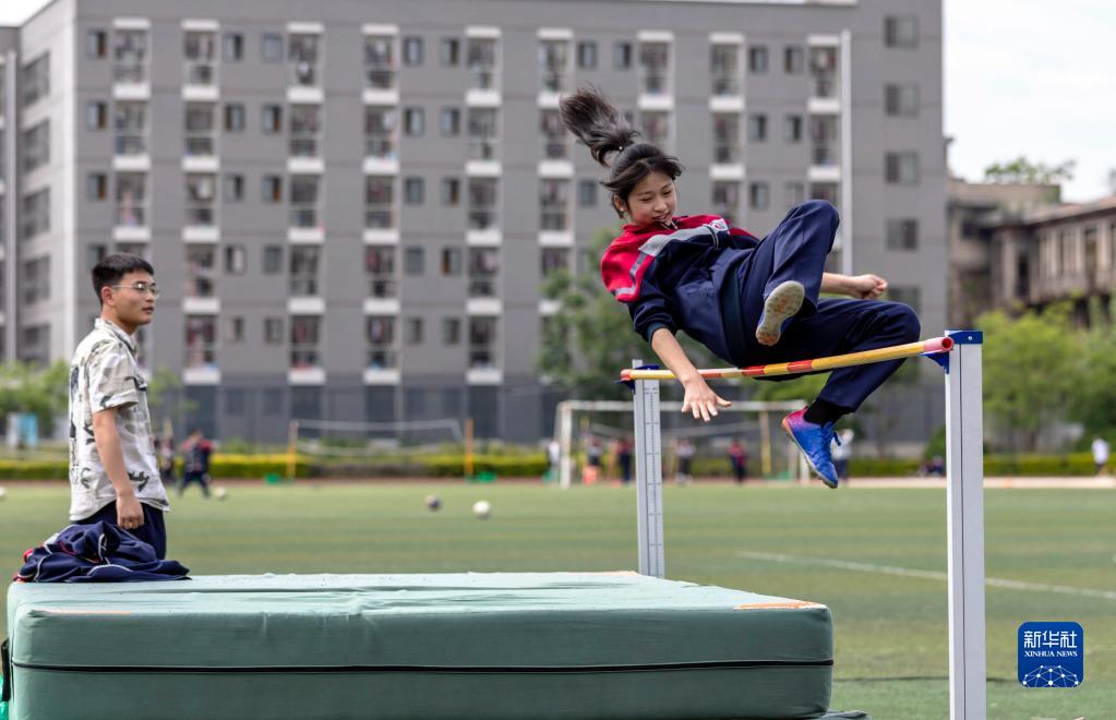 4月25日,在黔西第一中學,學生在進行田徑模塊跳高練習。
