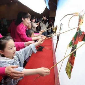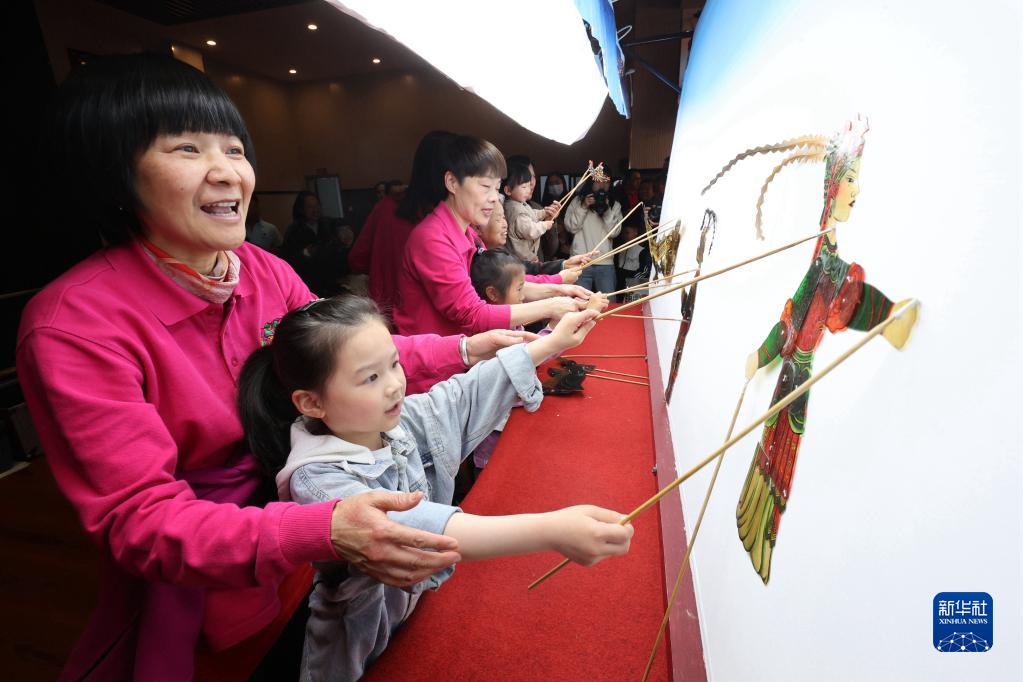 4月24日晚,在德清縣禹越鎮東港村文化禮堂,孩子們在體驗皮影戲表演。