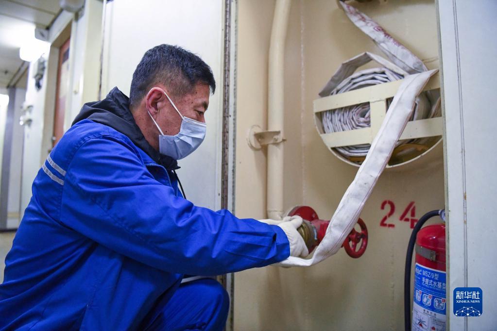 4月25日,中鐵渤海號渡船的工作人員檢查船上的消防設施。