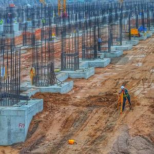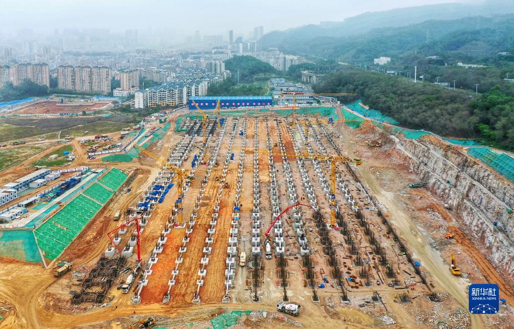 建設中的深圳地鐵5號線上水徑停車場正在進行底板獨立基礎混凝土澆筑和鋼筋籠綁扎作業(4月25日攝,無人機照片)。