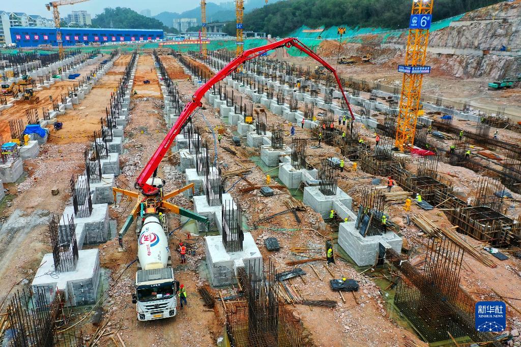建設中的深圳地鐵5號線上水徑停車場正在進行底板獨立基礎混凝土澆筑和鋼筋籠綁扎作業(4月25日攝,無人機照片)。