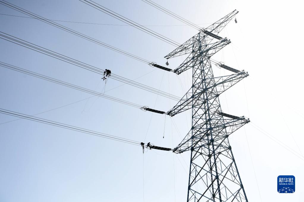 電力工人劉李家、段信陽、王春龍在高空作業(4月20日攝)。