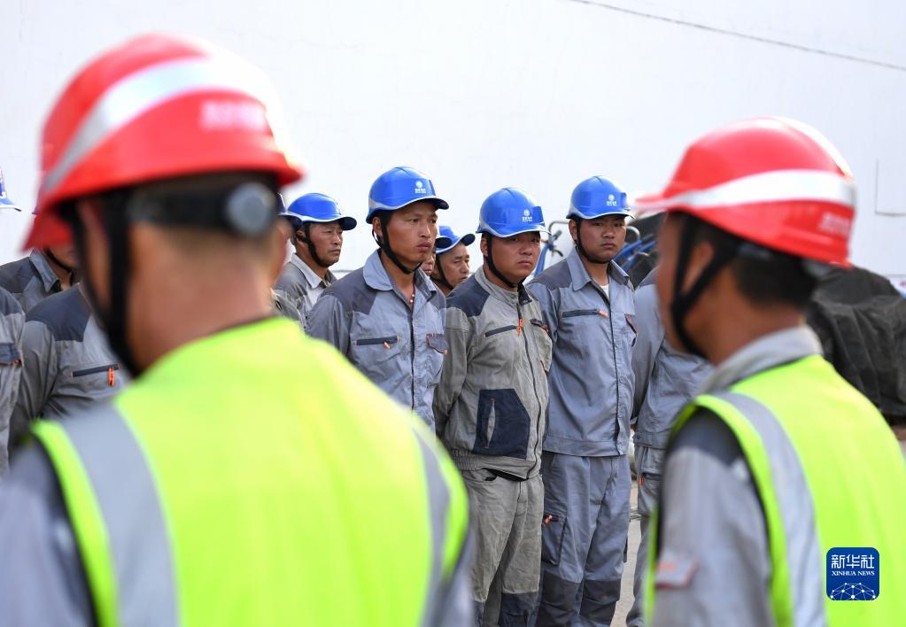 清晨六點多,電力工人在班會上分配一天的任務(4月20日攝)。