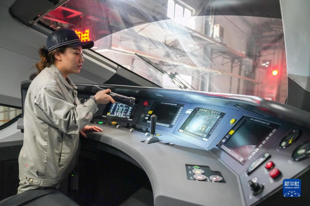 在哈爾濱動車段整備庫,機械師丁偉桐在動車組司機室檢查設備運行狀態(4月25日攝)。