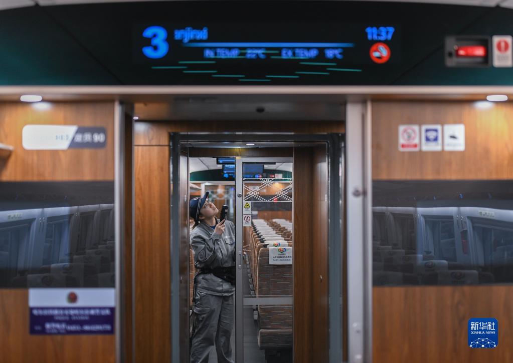 在中國鐵路哈爾濱局集團有限公司哈爾濱動車段整備庫,“雪絨花”女子班組的機械師們正緊張地為動車段配屬的動車組進行檢修作業,為即將到來的“五一”小長假鐵路運輸做好運力安全保障。