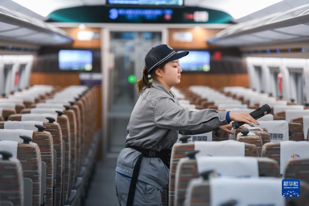 在哈爾濱動車段整備庫,機械師屈虹池在動車組車體內檢查座椅狀態(4月25日攝)。