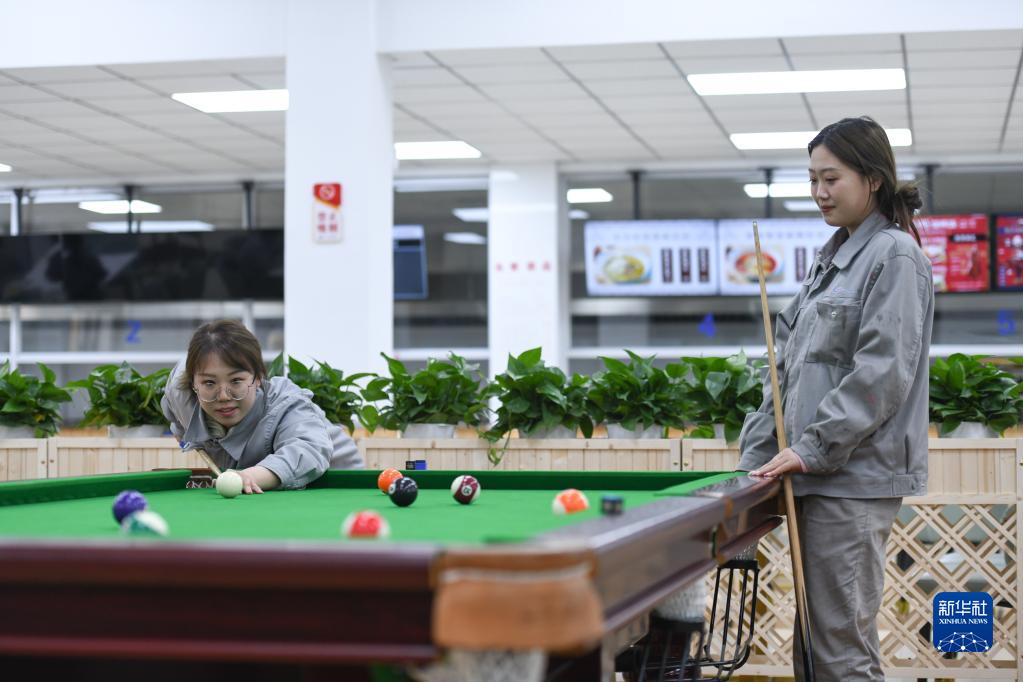 在哈爾濱動車段,于夢晗(左)在單位的休閑娛樂區域與同事康穎昕一同打臺球??捣f昕出生于2002年,去年剛入職的她是“雪絨花”女子班組中年齡最小的(4月25日攝)。